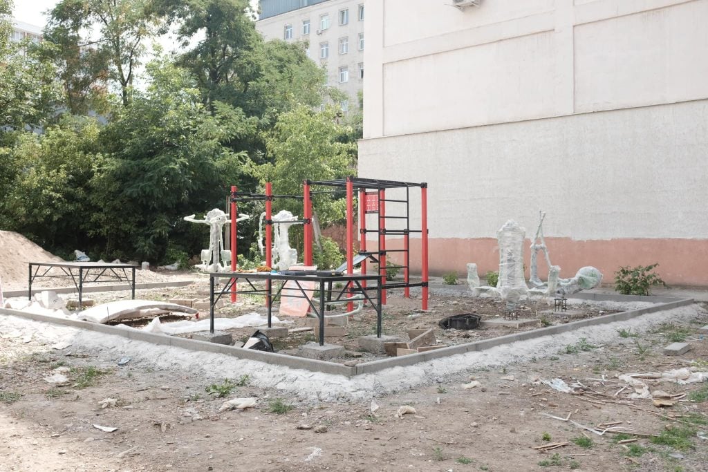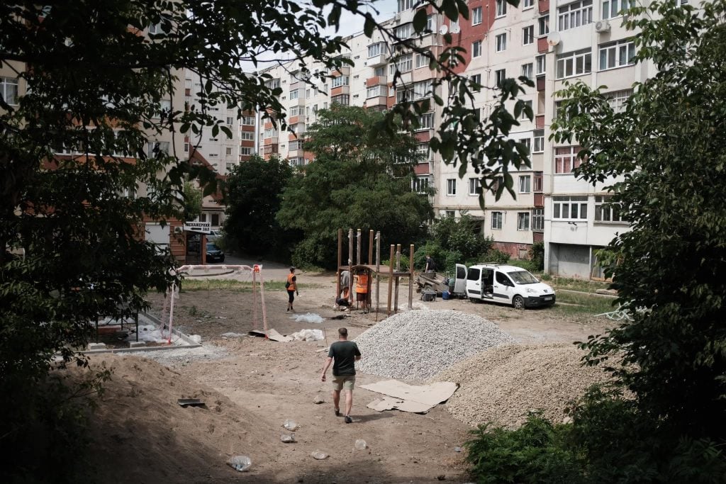 Зараз роботи тривають на трьох об’єктах. На фото — реалізація проєкту спортивно-дитячого майданчика на проспекті Незалежності.