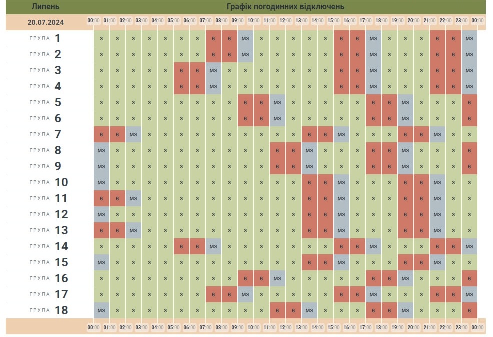 Як зазначають в обленерго, у графіку погодинних вимкнень відображаються години гарантованого ввімкнення електроенергії (зелені клітинки) та години, коли ваші оселі будуть точно знеструмлені (позначені червоним кольором).