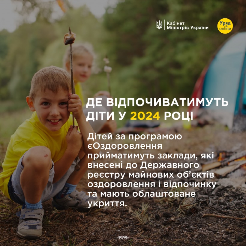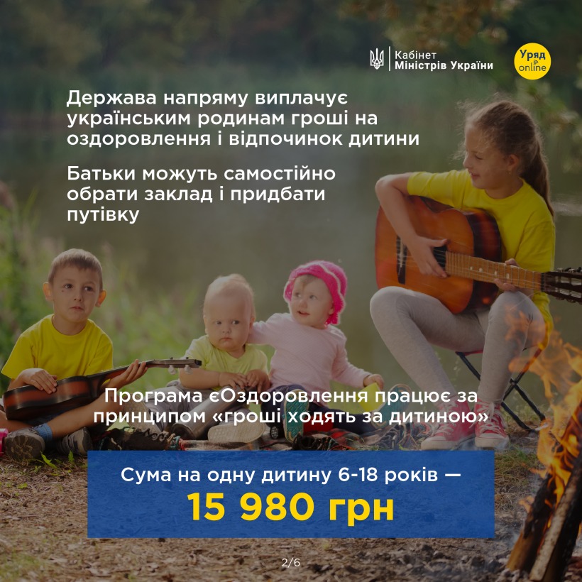 Держава напряму виплачує українським родинам гроші на оздоровлення і відпочинок дитини за програмою “єОздоровлення”. Батьки можуть самостійно обрати заклад і придбати путівку. Сума на одну дитину 6-18 років – 15 980 грн.