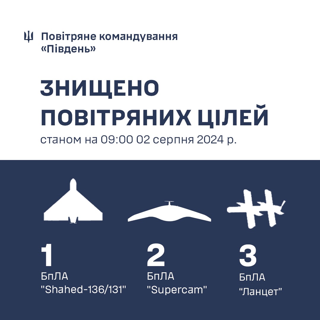 Згідно з інфографікою, наданою командуванням Повітряних сил ЗСУ, ППО збила один безпілотник типу Shahed, два БпЛА Supercam, три БпЛА "Ланцет", один БпЛА "Орлан-10". Тип ще чотирьох безпілотників уточнюють.