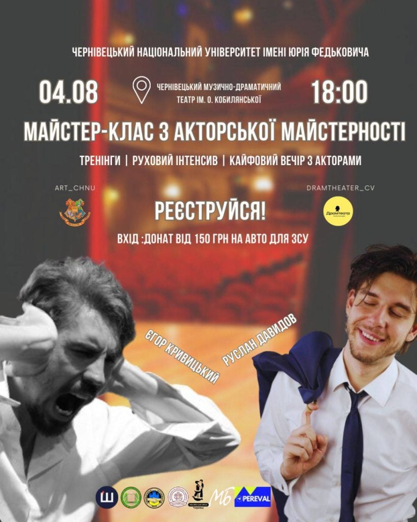 У неділю, 4 серпня, актори Чернівецького муздрамтеатру імені Ольги Кобилянської Єгор Кривицький та Руслан Давидів проведуть майстер-клас з акторської майстерності.