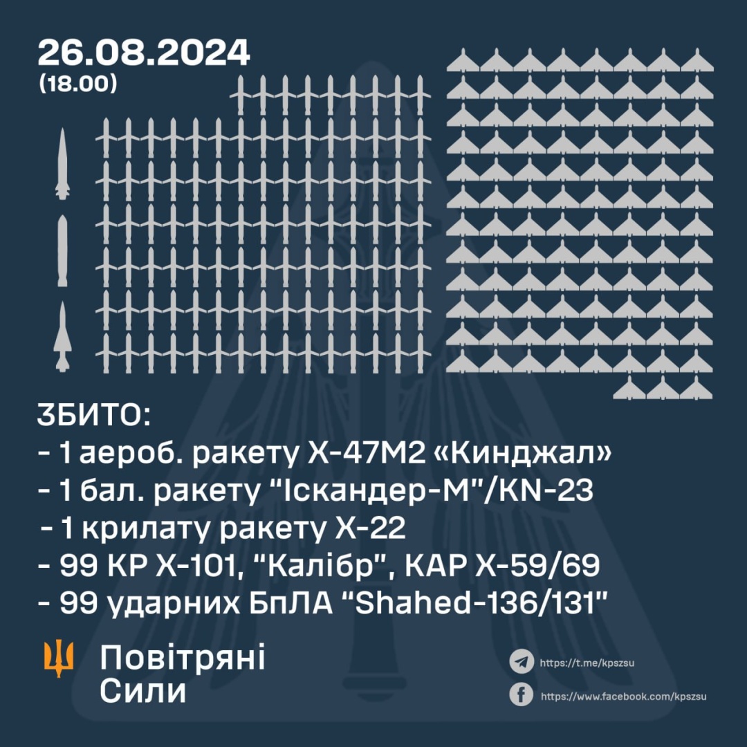 Під час наймасованішої російської атаки 26 серпня Повітряні Сили збили 102 російських ракет і 99 дронів із запущених 127 ракет і 109 БПЛА.