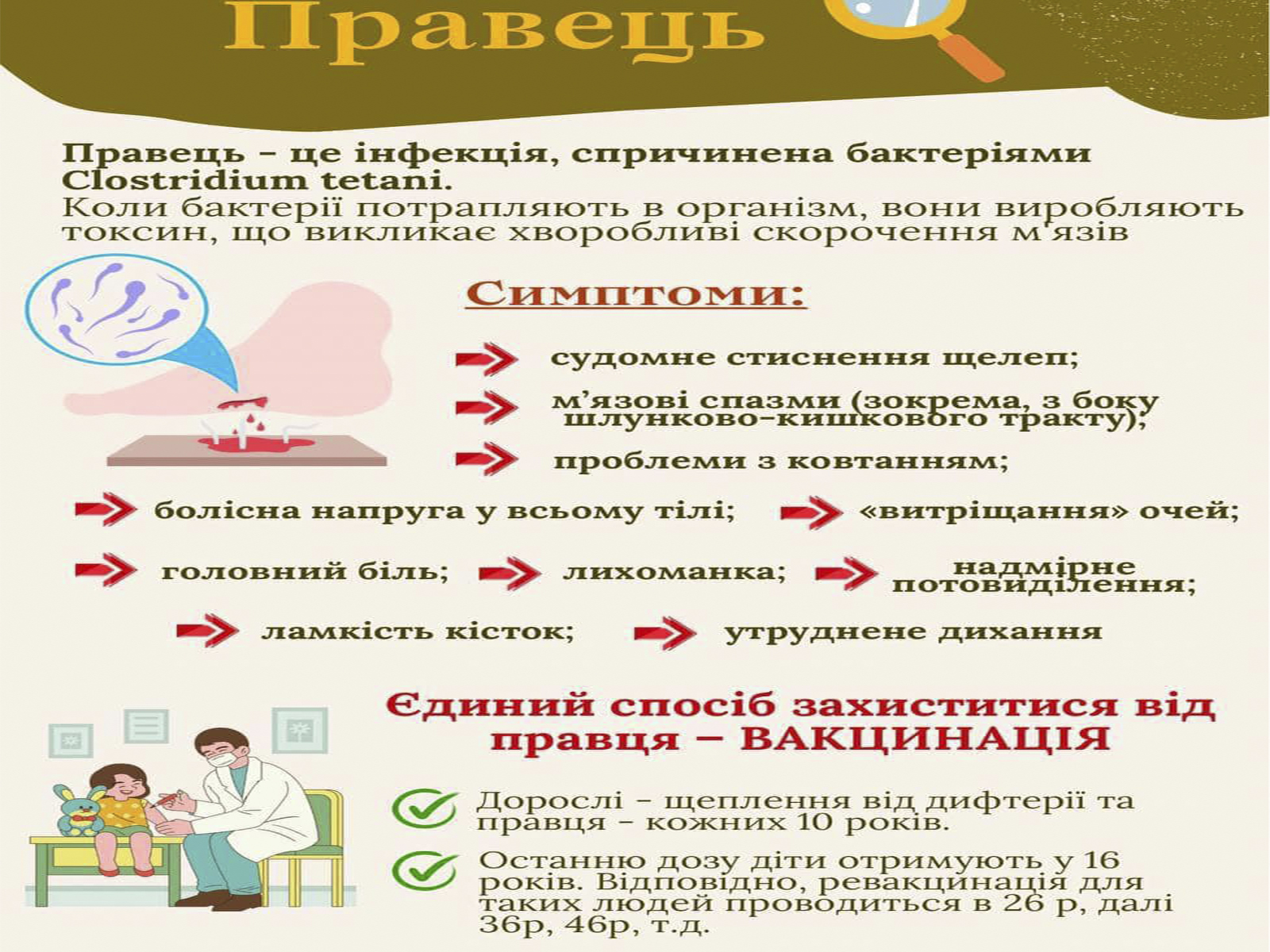 Єдиний спосіб захиститися від правця ‒ ВАКЦИНАЦІЯ! До початку навчального року переконайтесь, що ваша дитина має усі щеплення проти правця!