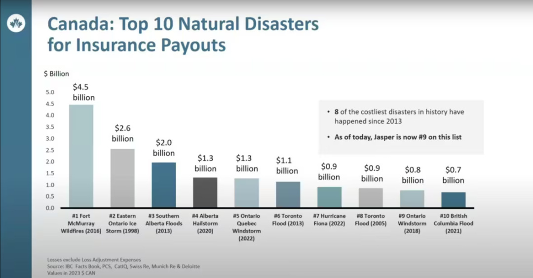 Рекордною зі страхових виплат у Канаді вважається лісова пожежа, що трапилася у місті Форт Макмюррей у 2016-му році. З урахуванням інфляції, втрати страховиків унаслідок тієї катастрофи, що спричинила значні руйнування у “столиці” нафтоносного регіону провінції Альберта, досягли 4,4 млрд дол.