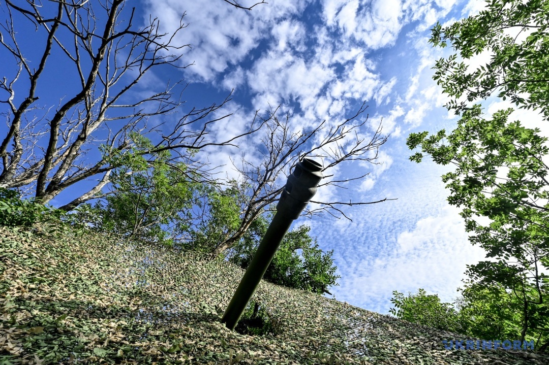 Тим часом ми доїхали, загнали пікап під дерева і далі вздовж посадки попрямували пішки. Раптово із зелені дерев вийшов незнайомий боєць й повідомив, що ми на місці. “Цезаря”, який стояв за три метри, з ґрунтової дороги побачити було неможливо.