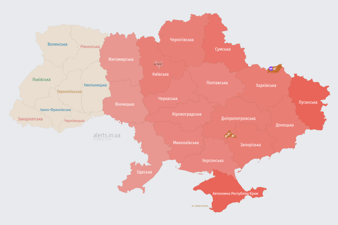 У столиці та більшості регіонів оголошено тривогу через загрозу ворожих ударних безпілотників.