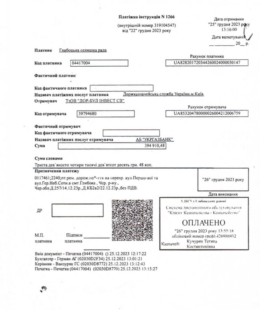 14 грудня 2023 року голова Глибоцької селищної ради, Григорій Ванзуряк, підписав акт виконаних робіт із ТОВ “ДОР-БУД ІНВЕСТ СВ” та перерахував 394 910,48 грн за ремонт дорожнього покриття на перехресті вулиць Першотравневої та Героїв Небесної Сотні (центральне перехрестя Глибоки). Однак, у 2023 році на цій ділянці дороги не проводили жодних ремонтних робіт.