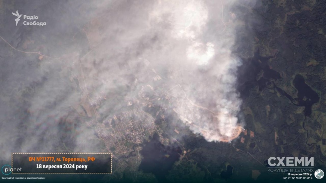 На супутникових знімках Planet Labs за 18 вересня видно масштабне задимлення на території військової частини №11777, яка відповідає за склад Головного ракетно-артилерійського управління Міністерства оборони РФ.