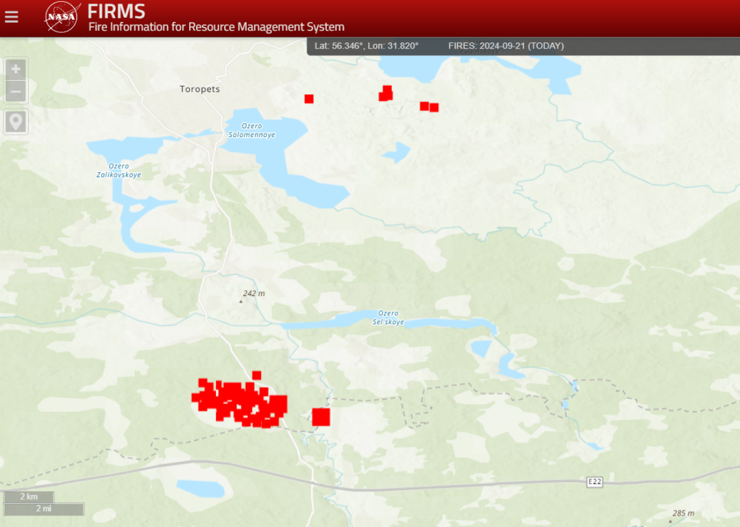 Відповідно до даних NASА, яке використовує дані зі своїх супутників для створення карт пожеж у реальному часі, масштабні осередки пожеж спостерігаються на складі за 15 км південніше Торопця. Також продовжує палати на складі, розташованому за кілька кілометрів східніше від міста, який був уражений кількома днями раніше.