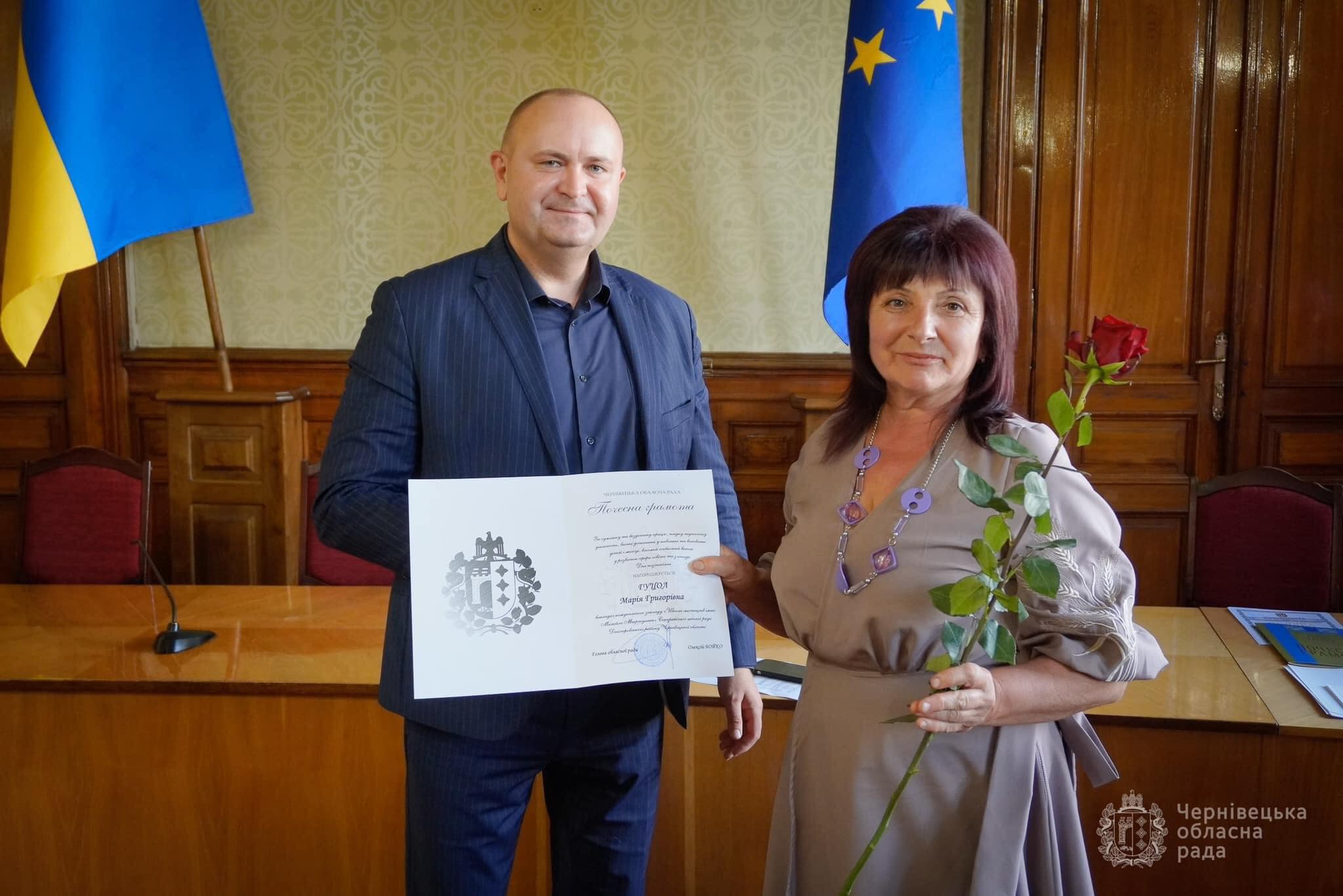 Почесними грамотами Чернівецької обласної ради та Департаменту освіти і науки обласної державної адміністрації (обласної військової адміністрації) нагороджені: викладачка класу «Бандура» музичного відділу комунального закладу «Школа мистецтв імені Михайла Мафтуляка» Марія Гуцол та методист, керівник гуртка «Мода і стиль» відділу позашкілля мистецької школи Ксенія Тихович.