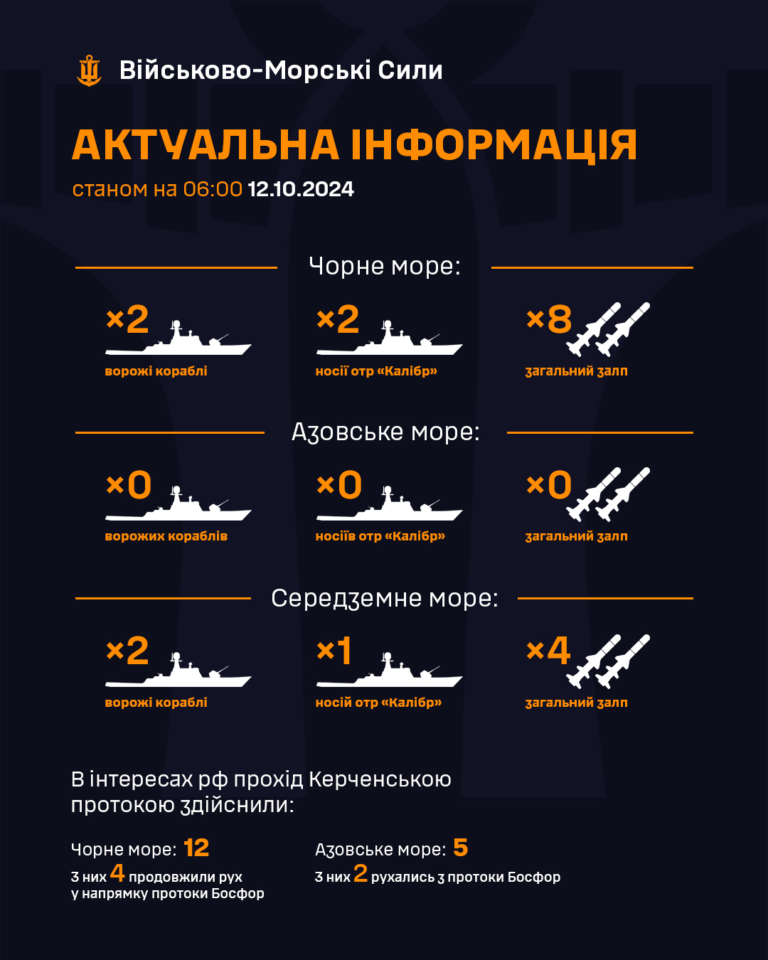 Як передає Укрінформ, про це повідомляють ВМС ЗСУ в оперативній інформації станом на 6:00 12.10.2024 у Фейсбуці.