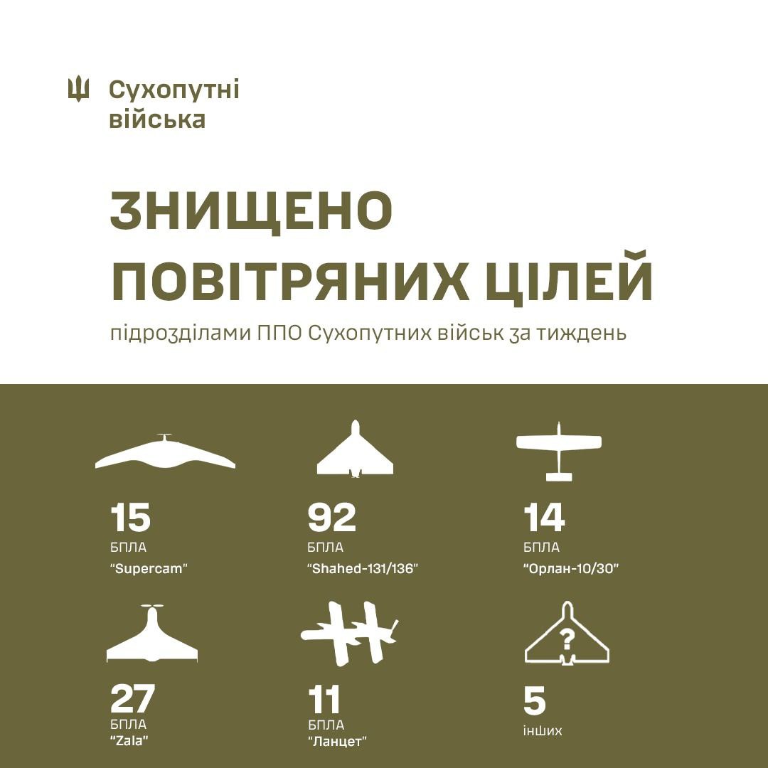 «ППО Сухопутних військ за минулий тиждень знищила 164 засоби повітряної розвідки та нападу противника», – йдеться в дописі.