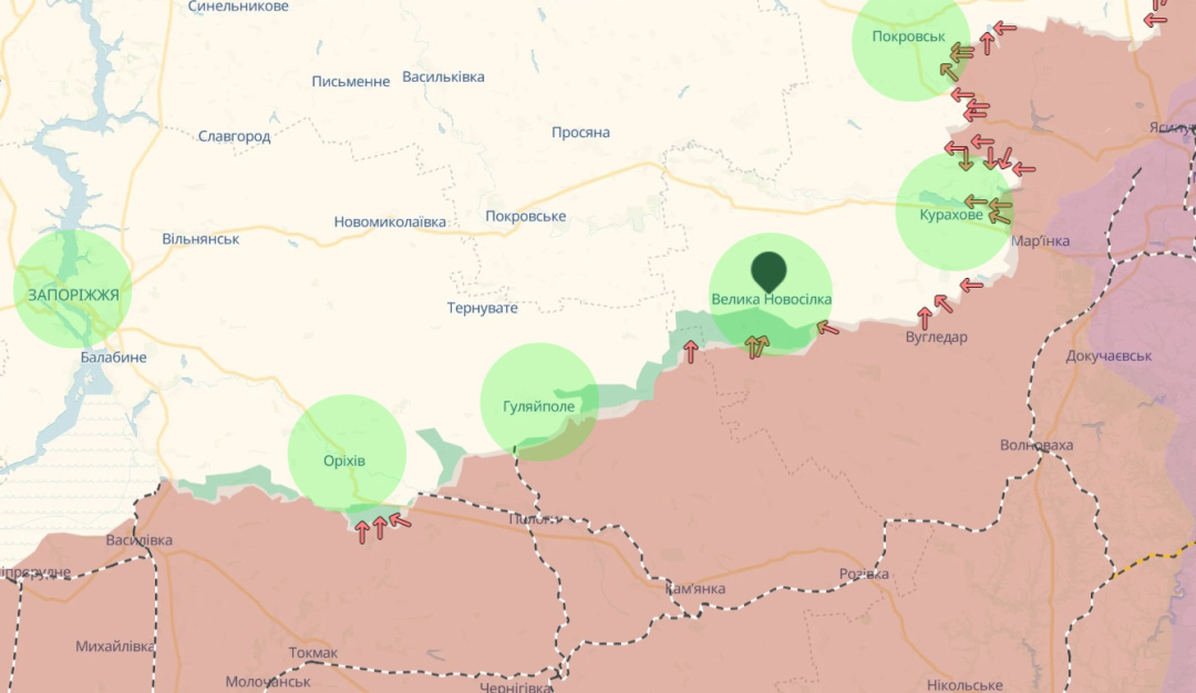 Або – Великої Новосілки (Времівський напрямок), яка знаходиться фактично на межі Донецької та Запорізької областей. І за якою, на відстані 15-16 кілометрів, знаходиться дорога, яка сполучає Запоріжжя та Курахове. Ворог прагне її перерізати, щоб зробити перебування наших військових у Кураховому та на його околицях неможливим. Зараз до Великої Новосілки росіяни намагаються просуватися одразу з трьох сторін: зі сторони Приютного у бік Новодарівки, а також зі сторони Старомайорського та Золотої Ниви у бік Макарівки та Благодатного.