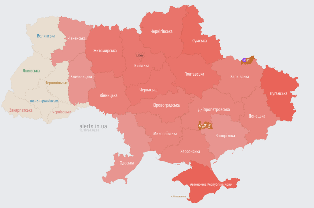 01:52 – у більшості областей – повітряна тривога, ПС ЗСУ інформують про рух "Шахедів": "БпЛА в східній частині Рівненщини, курс західний. БпЛА в південній частині Житомирщини, курс західний. БпЛА в північній частині Київщини, курс західний. БпЛА в південній частині Київщини, курс південно-західний. БпЛА в південній частині Чернігівщини, курс південно-західний. БпЛА в північній та південній частинах Сумщини, курс південно-західний. БпЛА в центральній частині Черкащини, курс південно-західний. БпЛА в західній та північній частині Полтавщини, курс південний. БпЛА в центральній частині Кіровоградщини, курс західний. БпЛА в західній частині Дніпропетровщини, курс північний. БпЛА в північній та східній частинах Миколаївщини, курс північно-західний. БпЛА західніше Одеси, курс північний".