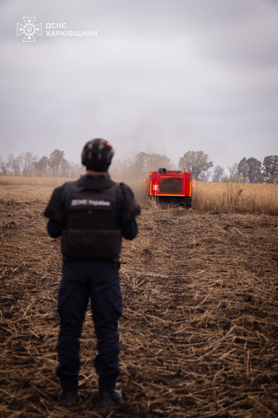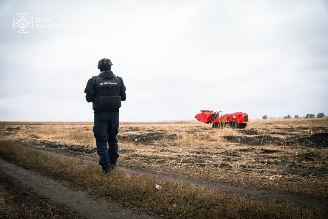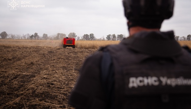 Працівники Державної служби з надзвичайних ситуацій показали роботу машини механізованого розмінування на сільськогосподарських угіддях у Харківській області.