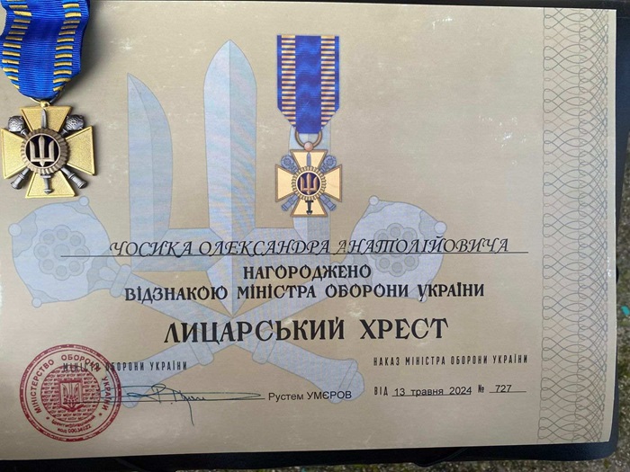 Жителя Сокирянщини, мужнього захисника Олександра Чосика нагороджено відзнакою Міністра оборони України «Лицарський хрест»