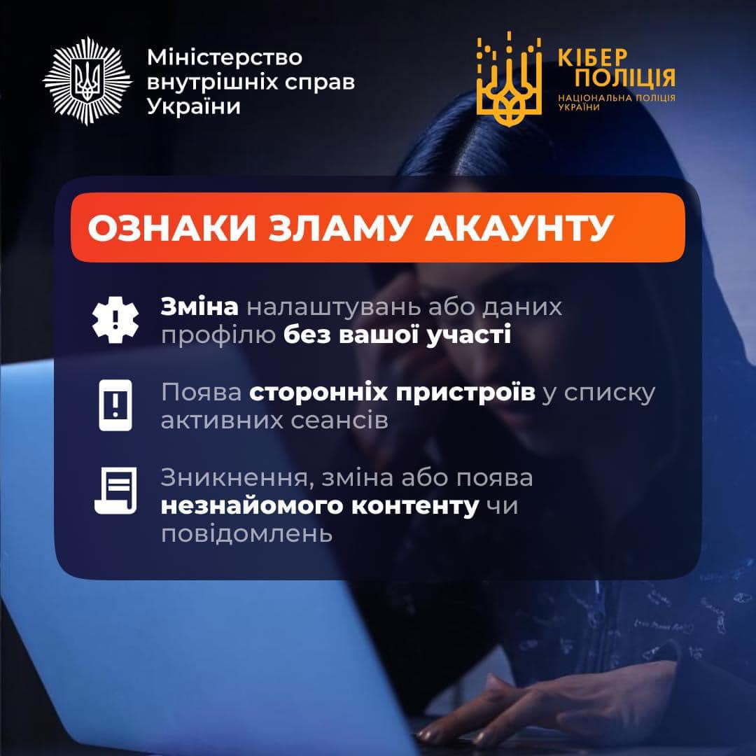 Національна поліція України разом з Кіберполіцією розповідають, як вчасно розпізнати ознаки компрометації, алгоритм дій у випадку зламу та як захистити свій акаунт.