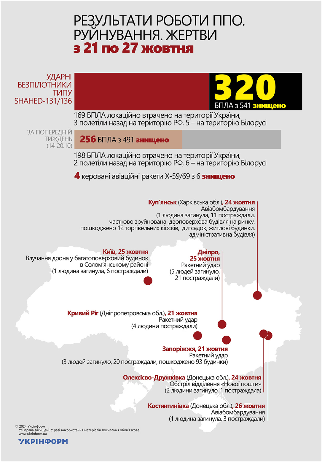 Внаслідок обстрілів російськими окупантами з 21.10 по 27.10 Донецької, Херсонської, Запорізької, Сумської та Харківської областей 32 людей загинуло, 98 отримали поранення.