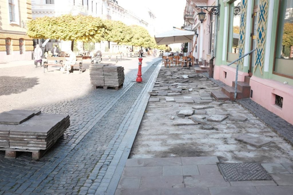У Чернівцях триває поточний ремонт тротуарів на вулиці Ольги Кобилянської. Тривалість робіт залежить від того, коли демонтують літні майданчики.