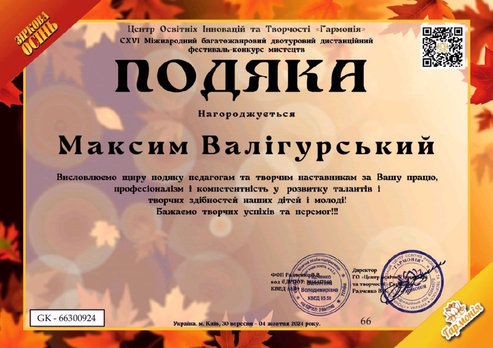 Лауреатом гран-прі премії CХІІІ Міжнародного багатожанрового двотурового дистанційного фестивалю-конкурсу мистецтв «Зіркова осінь» став Андрій Карп, під керівництвом викладача-наставника Максима Валігурського.