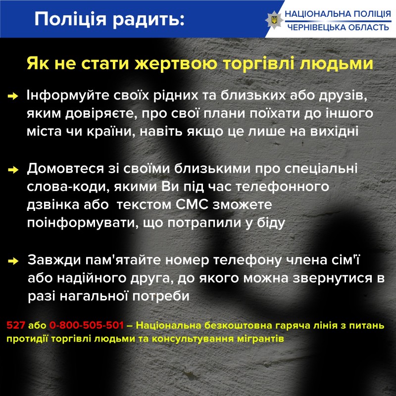 Поліцейські нагадують буковинцям як убезпечити себе під час поїздки за кордон, щоб не стати жертвою торгівлі людьми