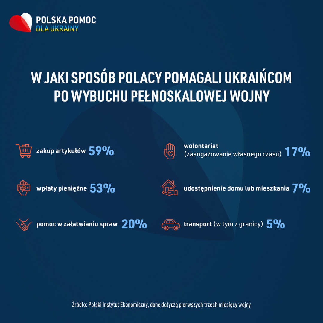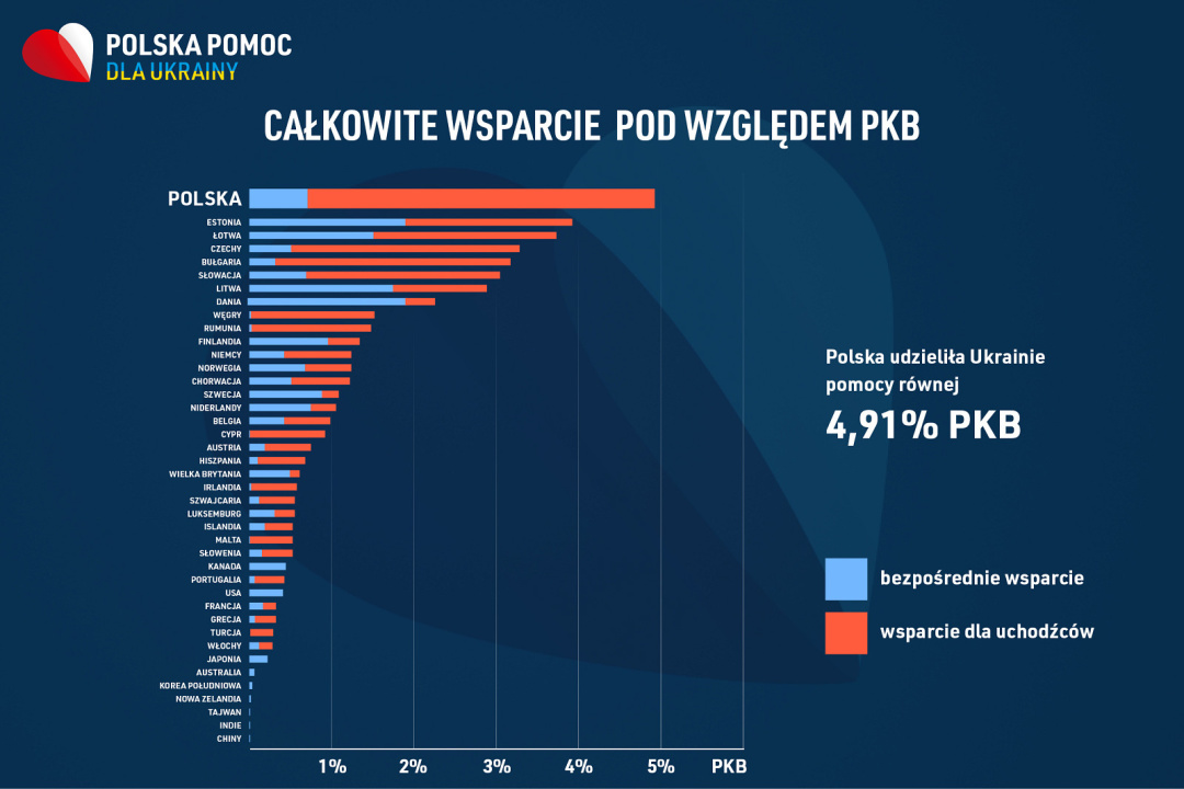 Польща виділила Україні та українським біженцям військової, матеріальної та гуманітарної допомоги у співвідношенні до ВВП країни найбільше у світі – майже 5% власного ВВП. Серед переданого військового озброєння, зокрема, 320 танків, 250 БМП, 14 літаків МіГ-29.