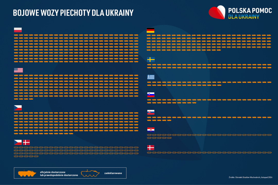 Крім того, із бронетехніки Варшава передала Києву 250 БМП, понад 100 САУ, понад 30 реактивних систем залпового вогню БМ-21 «Град», дев'ять розвідувальних машин БРДМ 2.