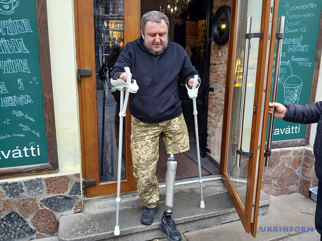 Пропонуємо Богдану піти на каву. Він погоджується, і ми прямуємо до виходу з міськради й показуємо на пандус, яким чоловік може зійти. Ветеран усміхається і каже: «Ви думаєте, що я не вмію ходити сходами? Пандусом не піду. От дивіться!». І впевнено, опираючись на милиці, долає кілька східців.