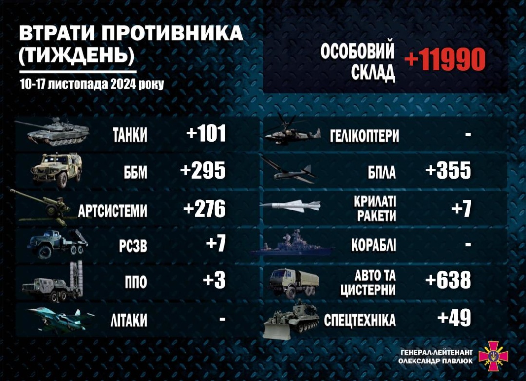 «За тиждень з 10 по 17 листопада 2024 року втрати противника склали близько 11990 осіб особового складу. Суттєвих втрат зазнали озброєння/військова техніка російських військ: 101 танк, 295 бойових броньованих машин, 276 артилерійських систем, 7 РСЗВ, 3 установки ППО, 638 одиниць автотехніки, 49 одиниць спецтехніки», – повідомив Павлюк.