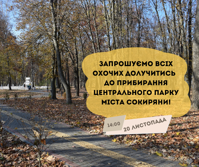 20 листопада о 14:00 годині відбудеться осіннє прибирання території центрального парку міста Сокиряни від опалого листя.