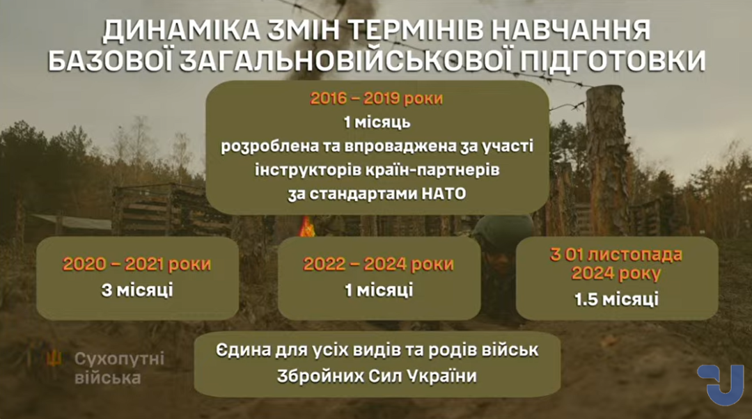 Дяченко уточнив, що у 2016 році програма підготовки, розроблена та впроваджена за участю інструкторів країн-партнерів за стандартами НАТО, тривала 1 місяць. У 2020-2021 рр. впроваджена підготовки з терміном навчання до 3 місяців, але після початку повномасштабного вторгнення РФ виникла необхідність підготовки численного мобілізаційного ресурсу, тому виникла потреба у зменшенні курсу.