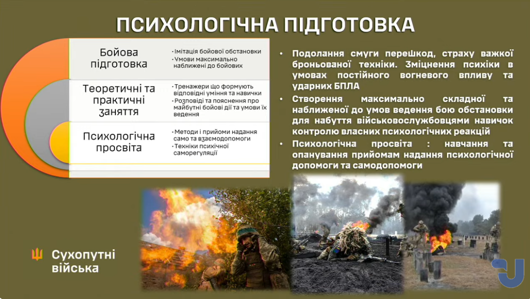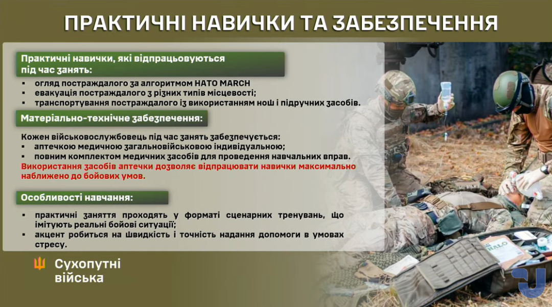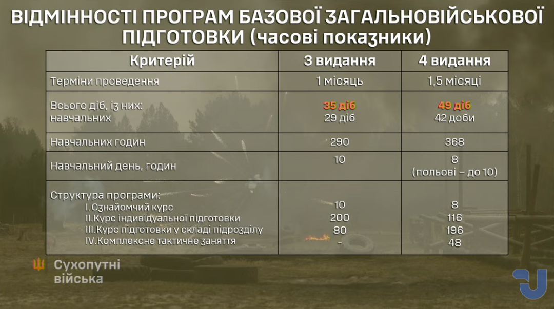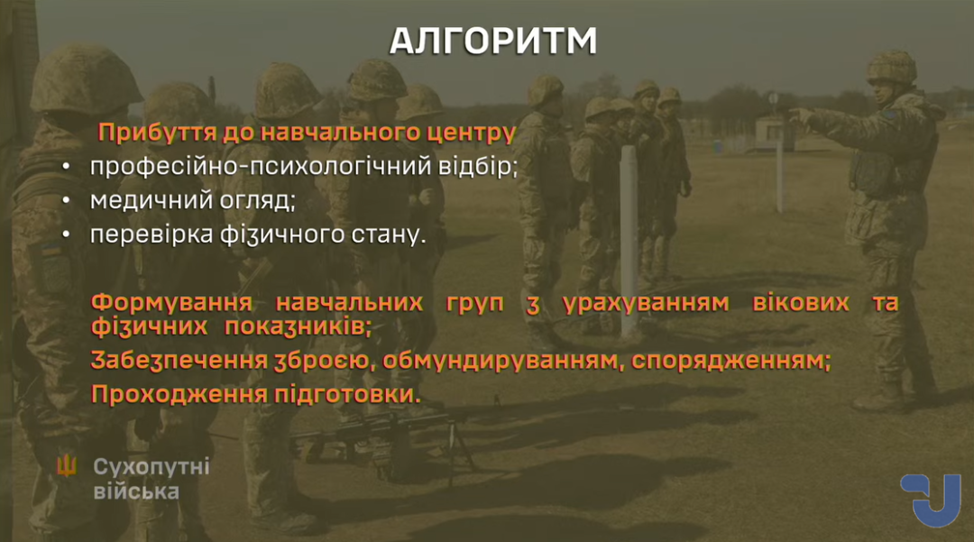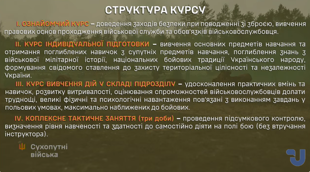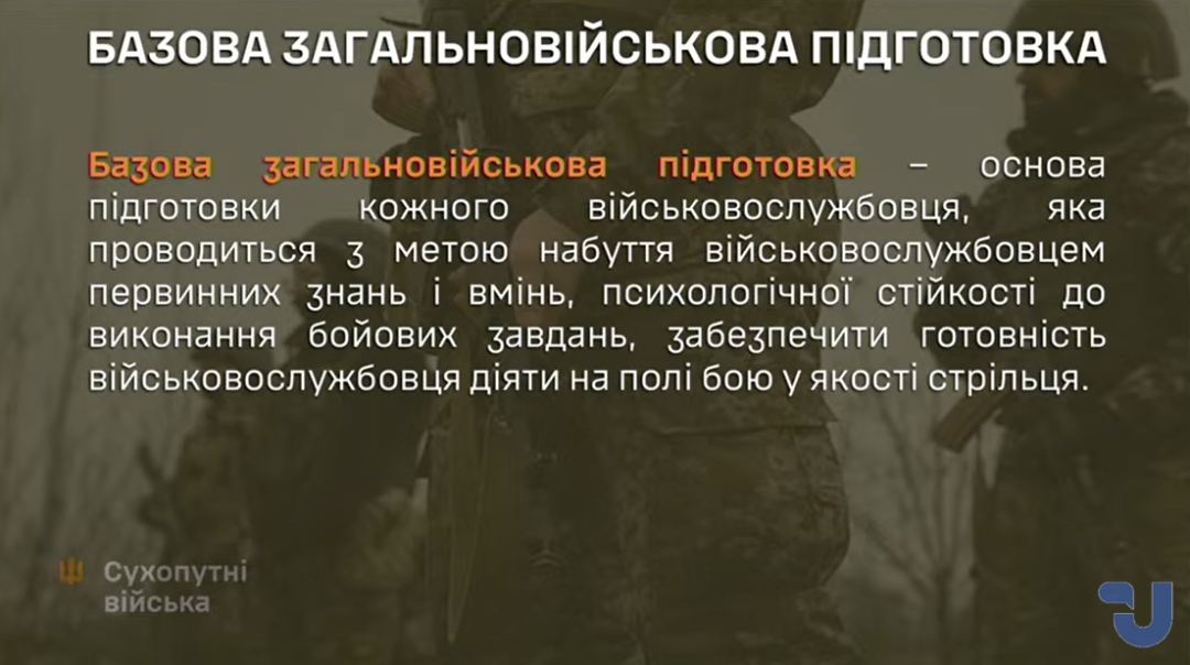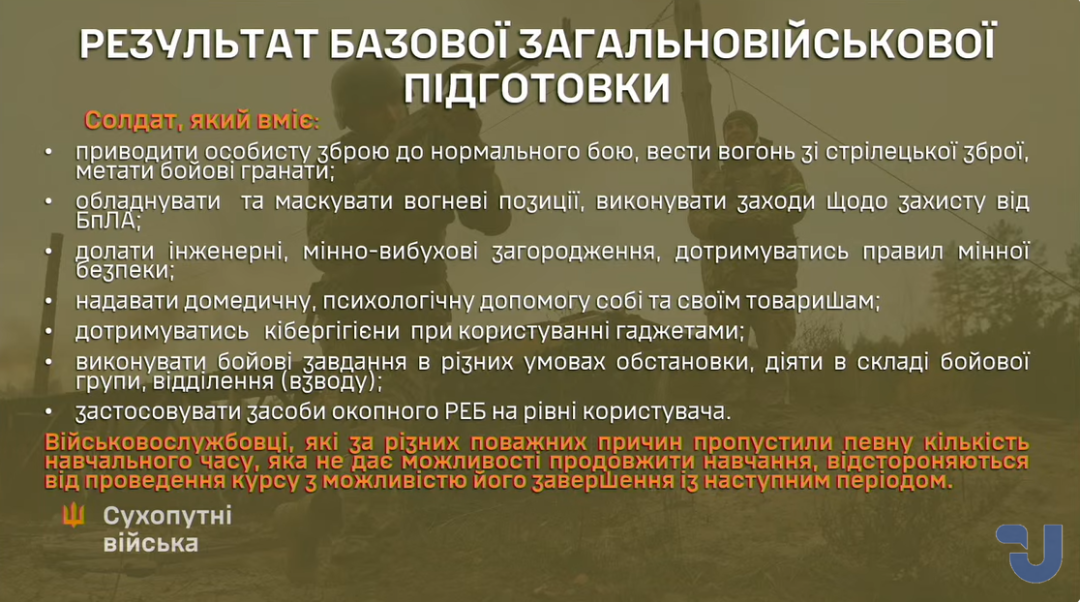 «Базова загальновійськова підготовка проводиться з усіма військовослужбовцями, які призиваються на військову службу як за контрактом, так і по мобілізації. Основною метою підготовки є набуття військовослужбовцем знань та навичок, які потрібні для ведення бойових дій. Програма однакова для всіх військовослужбовців Збройних сил України, для всіх родів військ,.. розробляється та затверджується Генеральним штабом ЗСУ. Підготовка проводиться в навчальних центрах та навчальних центрах підготовки підрозділів кваліфікованим інструкторським викладацьким складом, який має бойовий досвід», – сказав Дяченко.