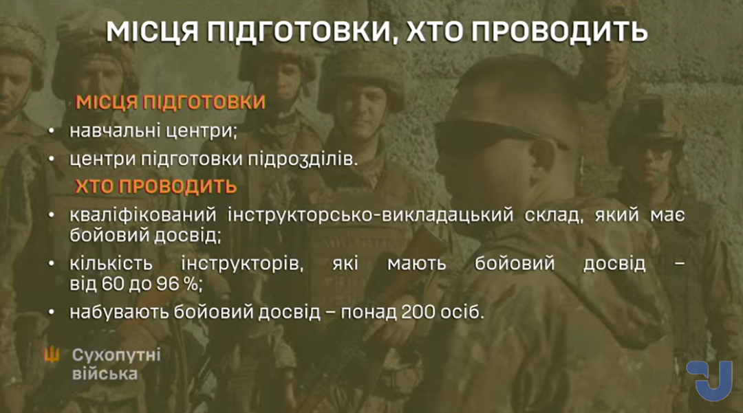 В Україні базова загальновійськова підготовка однакова для всіх видів і родів військ і триває 1,5 місяці, більшість інструкторів у навчальних центрах мають бойовий досвід.