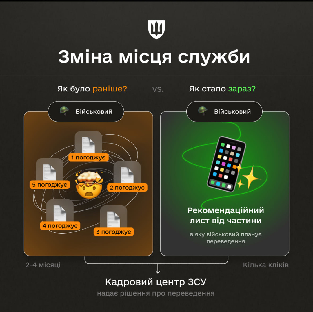 Як пояснила заступниця міністра, Міноборони прибрало низку погоджень та бюрократичних перешкод між запитом військового і рішенням про його переведення. Тепер військовослужбовцю не потрібно погоджувати свій рапорт із командиром у застосунку і вказувати його Армія ID — за військових це погодження отримає Кадровий центр.