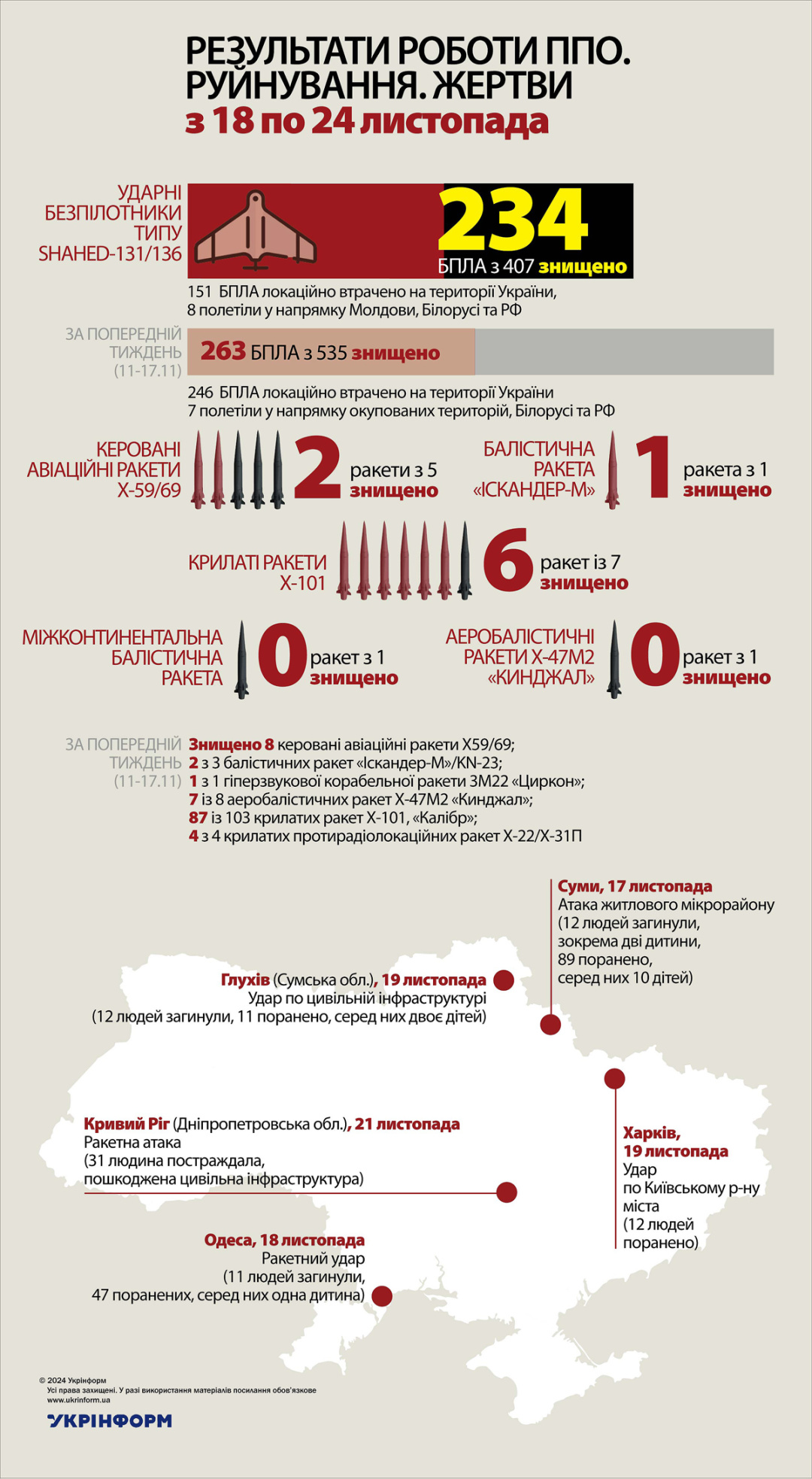 Внаслідок обстрілів російськими окупантами з 18.11 по 24.11 Донецької, Херсонської, Миколаївської, Запорізької та Харківської областей 22 людей загинули, 116 дістали поранення.