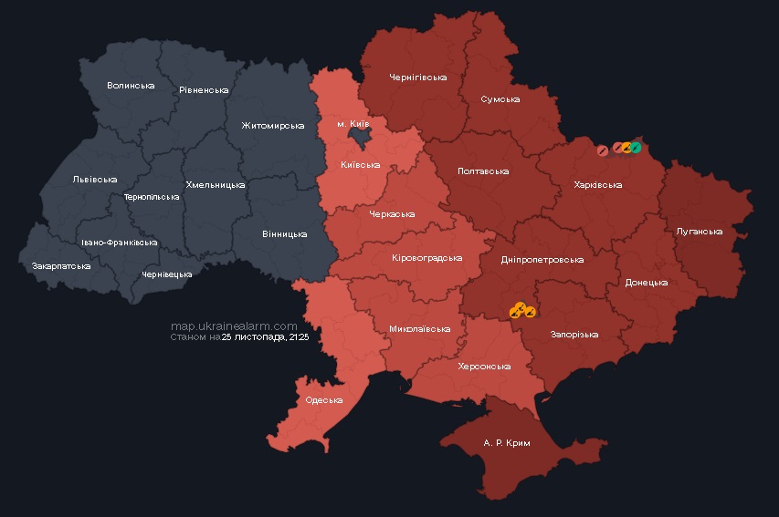 21:12 – повідомляється про рух БпЛА із акваторії Чорного моря курсом на Одещину і Миколаївщину.