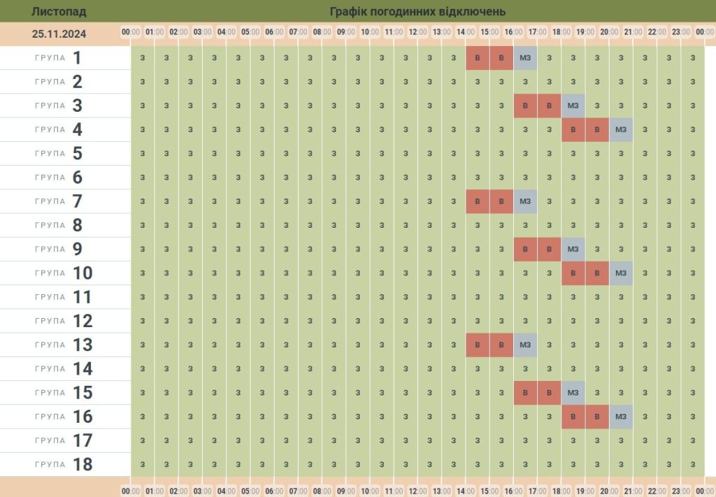 У графіку погодинних вимкнень відображаються години гарантованого ввімкнення електроенергії (зелені клітинки) та години, коли ваші оселі будуть точно знеструмлені (позначені червоним кольором).