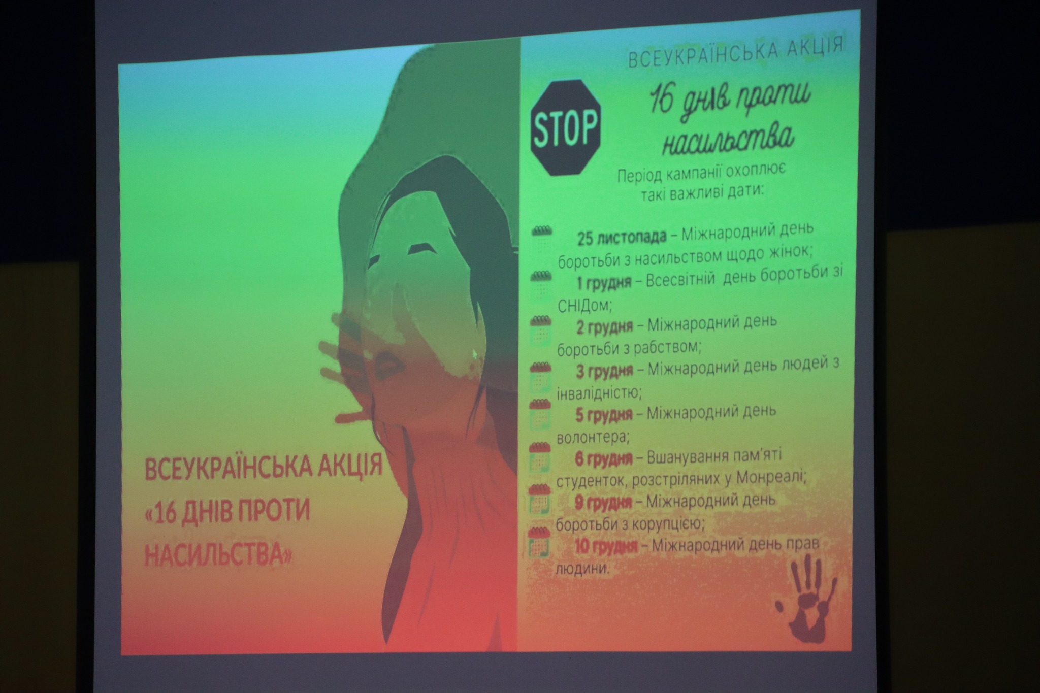 Щорічно в Україні з 25 листопада до 10 грудня включно проводиться Всеукраїнська кампанія «16 днів проти насильства» з метою привернення уваги суспільства до проблем подолання насильства у сім’ї, жорстокого поводження з дітьми, протидії торгівлі людьми та захисту прав жінок.