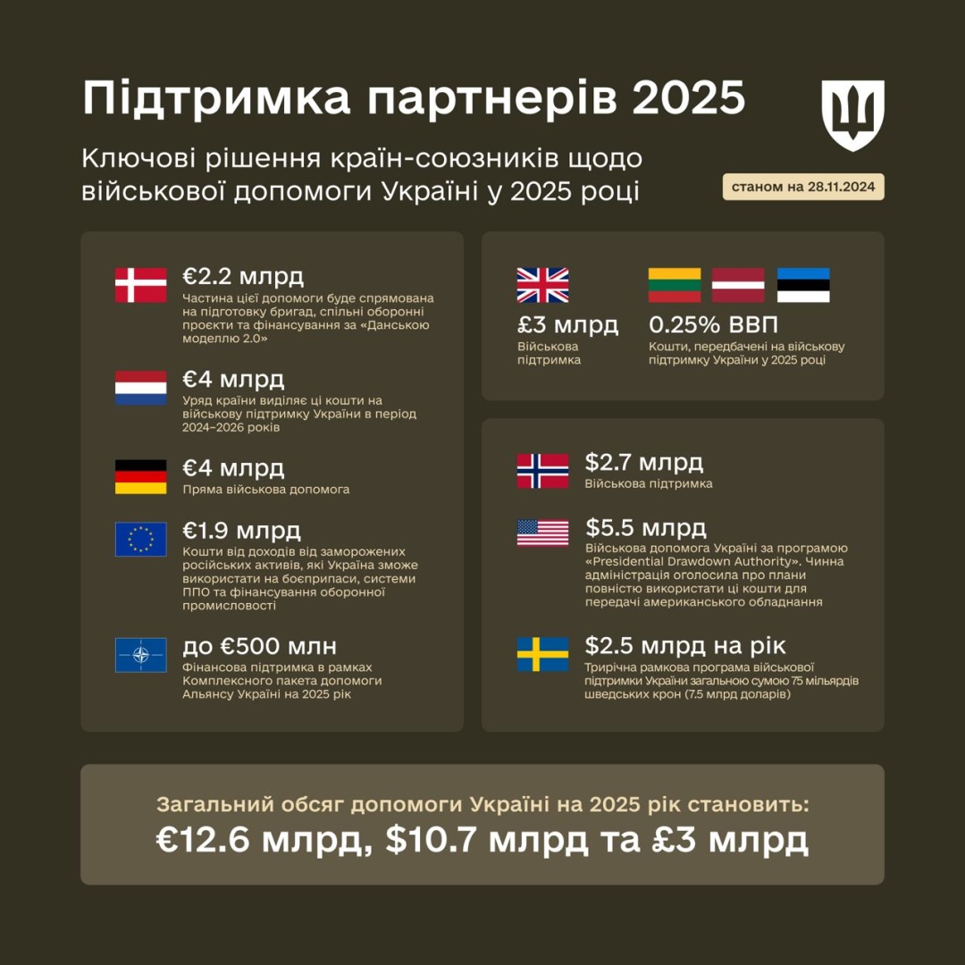 • Данія до 2028 року виділить 8,7 млрд євро. За даними Умєрова, у 2025 році військова допомога становитиме 2,2 млрд євро, включаючи спільні проєкти та інвестиції за "данською моделлю 2.0";