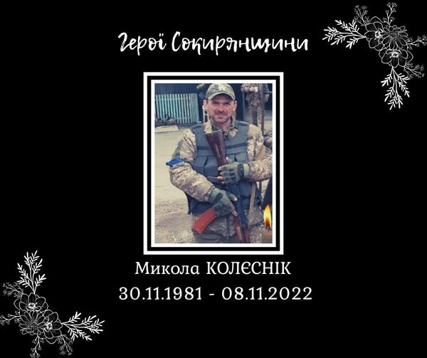 Воїн загинув на Луганщині у листопаді 2022 року. Микола Колєснік потрапив під артилерійський обстріл з боку російських загарбників – внаслідок чого отримав множинні осколкові поранення не сумісні з життям.