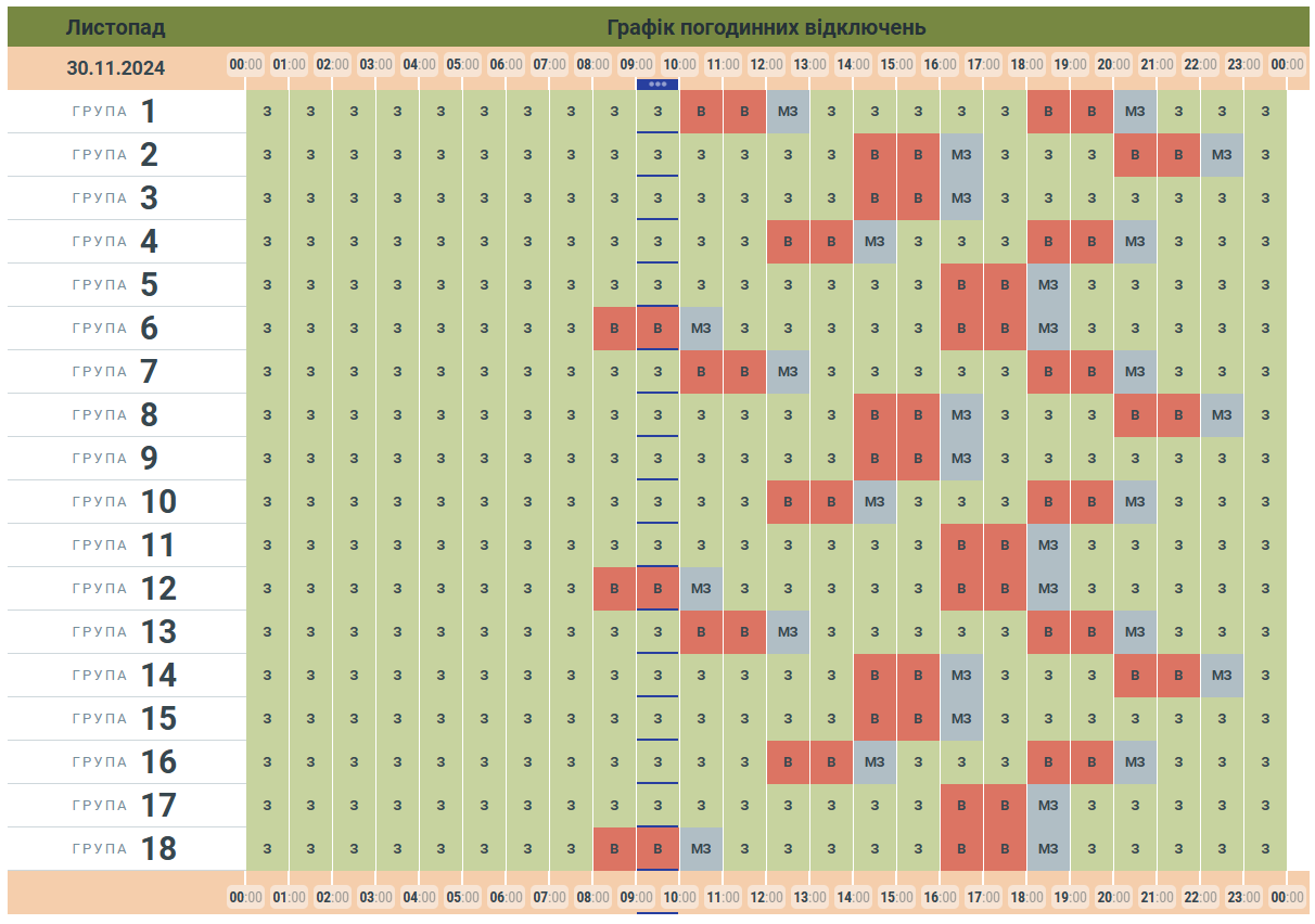 У графіку погодинних відключень відображають години гарантованого включення електроенергії (зелені клітинки) та години, коли ваші оселі будуть точно знеструмлені (позначені червоним кольором).