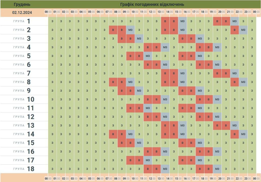 У графіку погодинних відключень відображають години гарантованого включення електроенергії (зелені клітинки) та години, коли ваші оселі будуть точно знеструмлені (позначені червоним кольором).