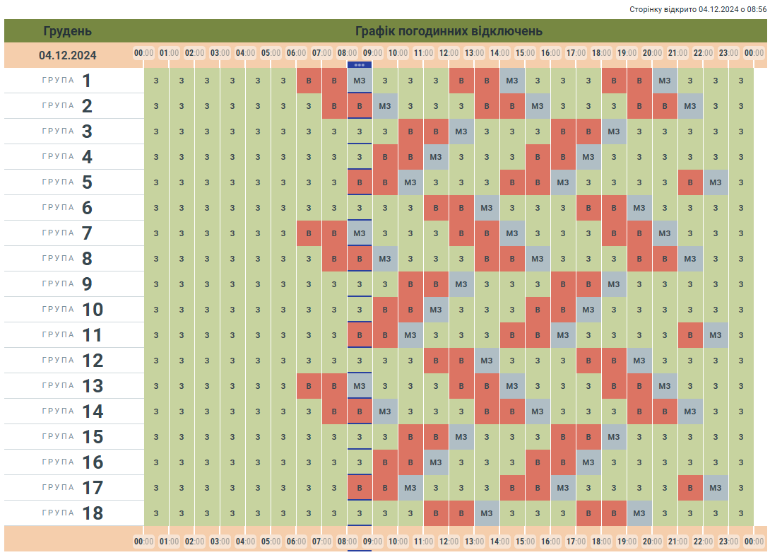Клітинки сірого кольору в графіку – це той час, коли кожна група може бути заживлена, залежно від змін у лімітах споживання або зменшенню споживанню електроенергії. Також години сірої зони використовують як запасний час для перемикання між групами, щоб виконати необхідні технічні та безпекові дії.