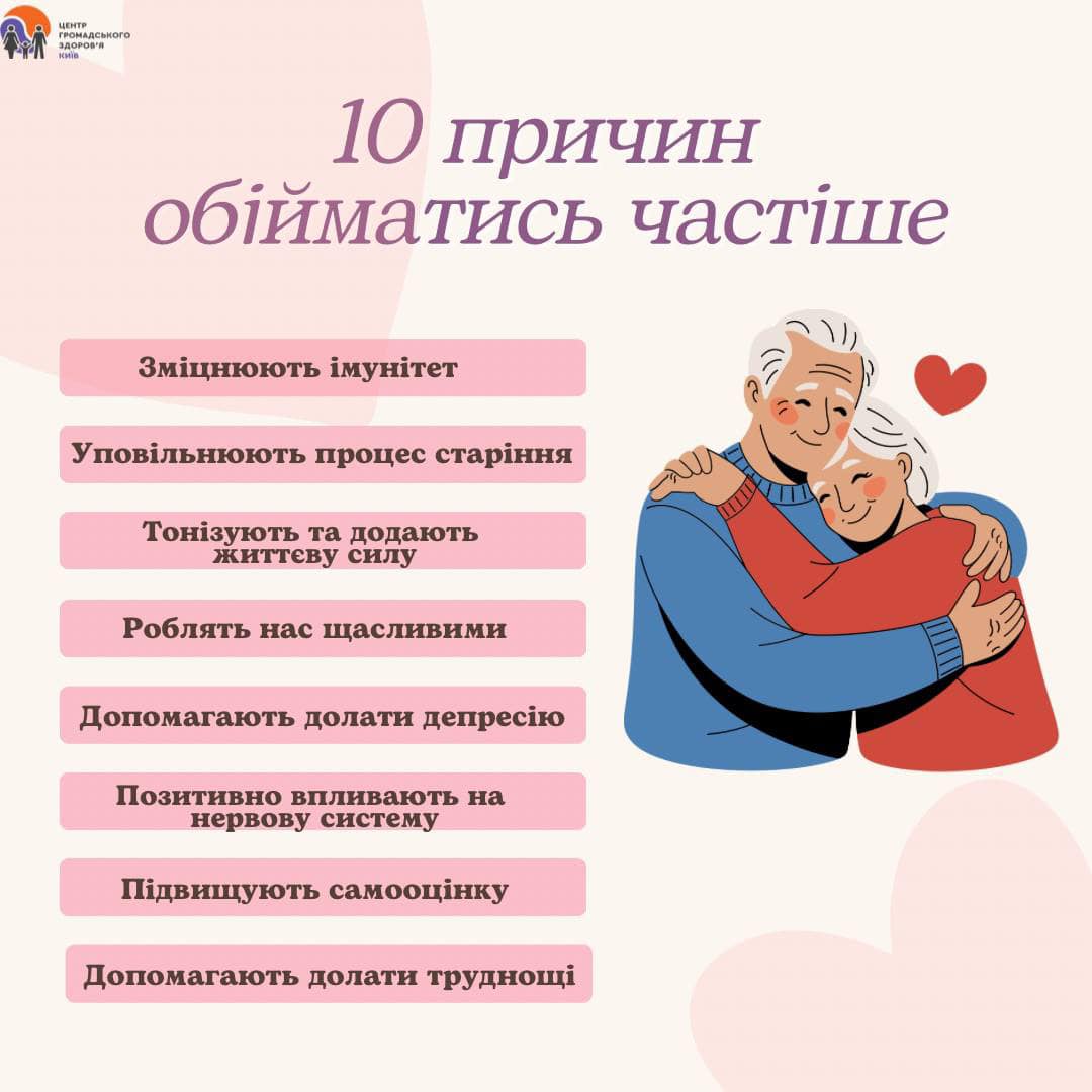 - Зміцнюють імунітет. Обійми, які тривають 20 сек. і більше мають терапевтичний ефект, позитивно впливають на організм, допомагають протидіяти хворобам.