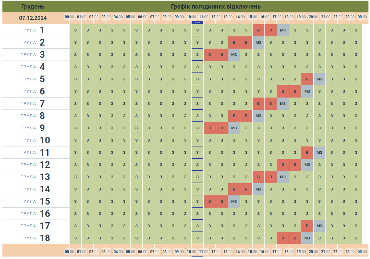 Клітинки сірого кольору в графіку – це той час, коли кожна група може бути заживлена, залежно від змін у лімітах споживання або зменшенню споживанню електроенергії. Також години сірої зони використовують як запасний час для перемикання між групами, щоб виконати необхідні технічні та безпекові дії.