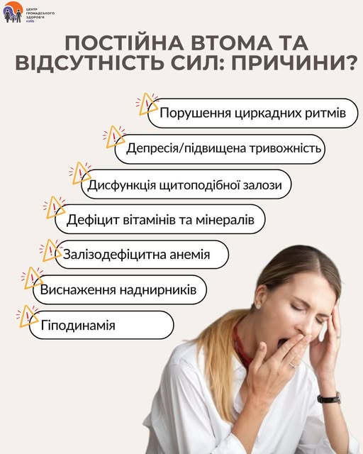 - Дисфункція щитоподібної залози. Якщо ви відчуваєте втому без суттєвих навантажень або вам постійно хочеться спати, то потрібно звернутися до ендокринолога, аби виключити гіпотиреоз.