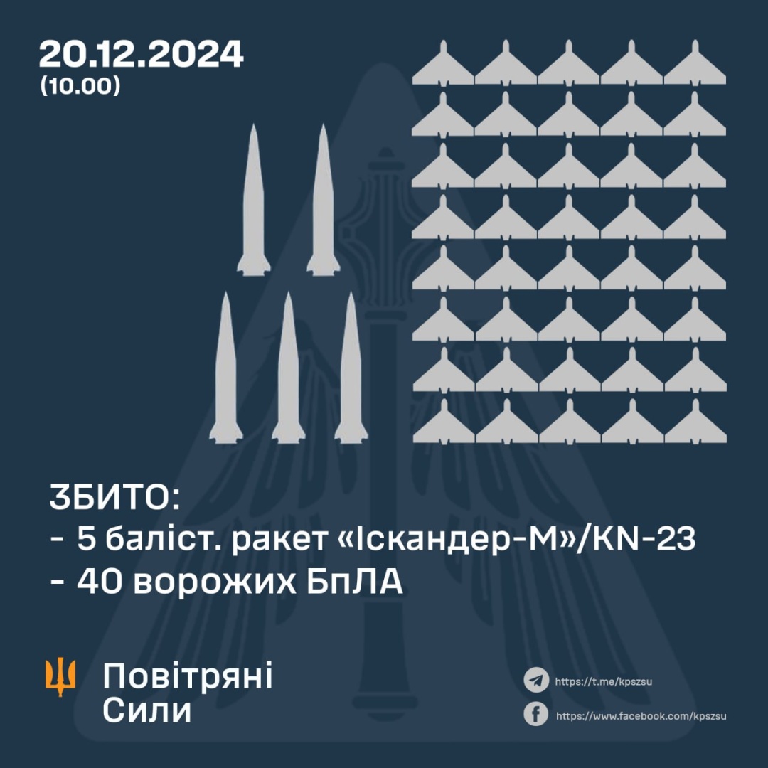 Сили оборони України збили п’ять балістичних ракет та 40 російських безпілотників, якими армія Російської Федерації атакувала Україну у ніч на 20 грудня, ще 20 локаційно втрачені.