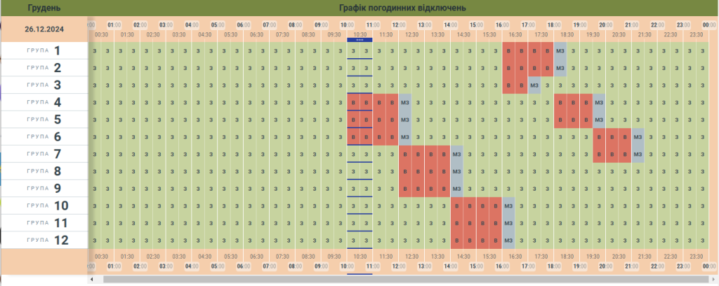 Клітинки сірого кольору в графіку – це той час, коли кожна група може бути заживлена, залежно від змін у лімітах споживання або зменшенню споживанню електроенергії. Також години сірої зони використовують як запасний час для перемикання між групами, щоб виконати необхідні технічні та безпекові дії.