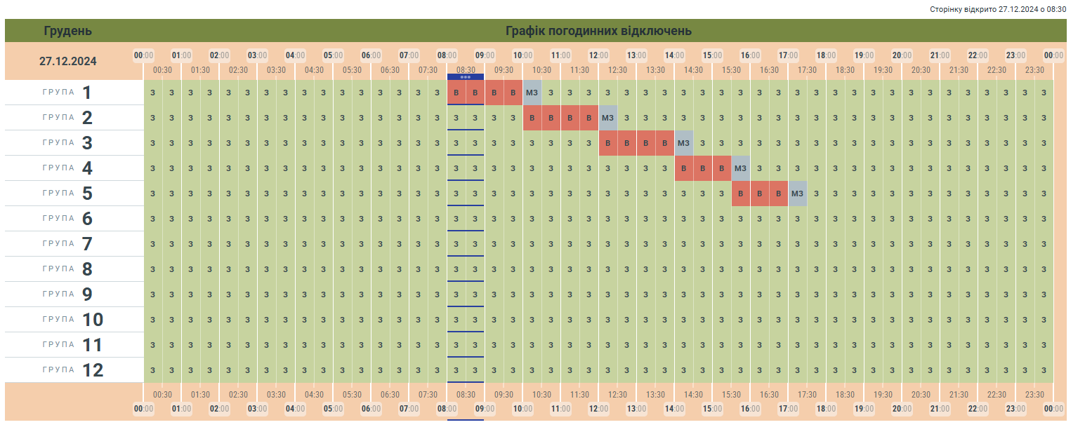 АТ «Чернівціобленерго» оприлюднило графік погодинних відключень електроенергії на сьогодні, 27 грудня.
