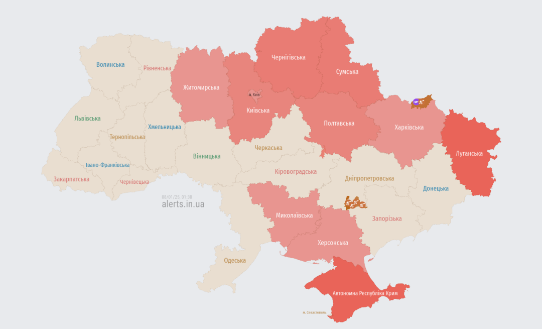 Актуальна карта повітряних тривог станом на 01:30. Джерело: https://alerts.in.ua/